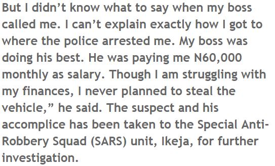 A 25 year old company driver known as Daniel Ogunlade has been captured by the agents of the Rapid Response Squad (RRS), Lagos Police Command for taking the official transport of an organization which he works with. Tribune reports that Daniel who stole the auto when he went on an errand for his manager, was found by the police in Ifo, Ogun state with the bus.