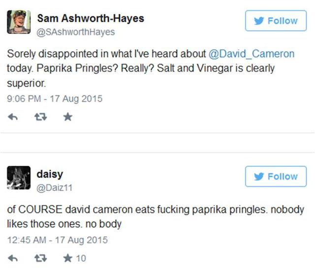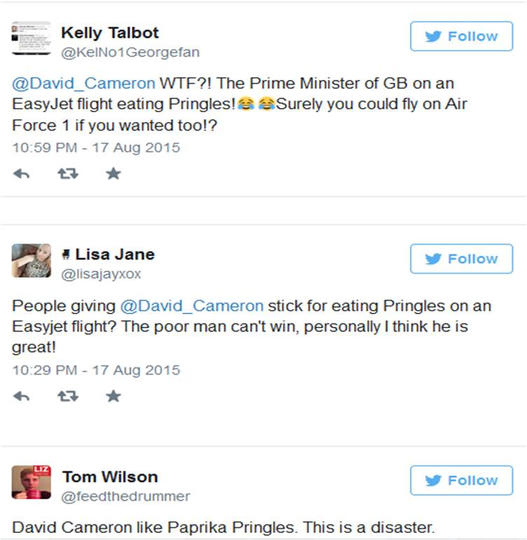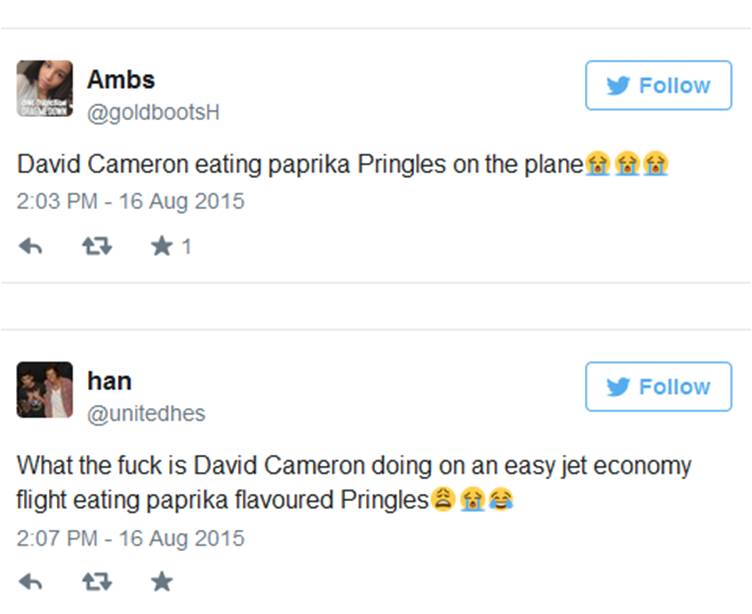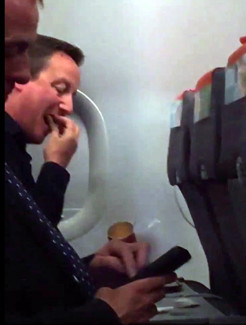 Can you imagine President Buhari or Ex-president Obasanjo flying Aero Contractors and eating gala during the flight, well that was precisely what the prime minister of Britain did, when a young lady with a camera was astonished after she took photographs of a man eating cheap paprika pringles on the economy class of an easy jet aircraft. Her frightfulness showed when on a more critical look, she found that the pringles eating man was British Prime Minister David Cameron. As though the astounded was insufficient for the young lady who spotted him, he was additionally caught up with stuffing his mouth full with Paprika Pringles so unaware of his immediate environment.