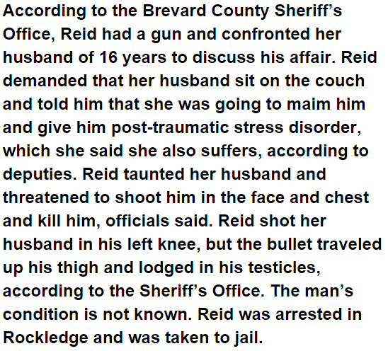 A bullet held up in a Brevard County man’s testicles after he was shot by his 60-year-old wife in a contention over an affair, as indicated by authorities. Victoria Reid was captured Wednesday on accuses of aggravated battery of a lethal weapon abusive behavior at home and aggravated assault domestic violence.