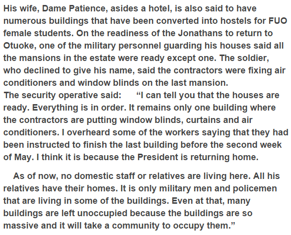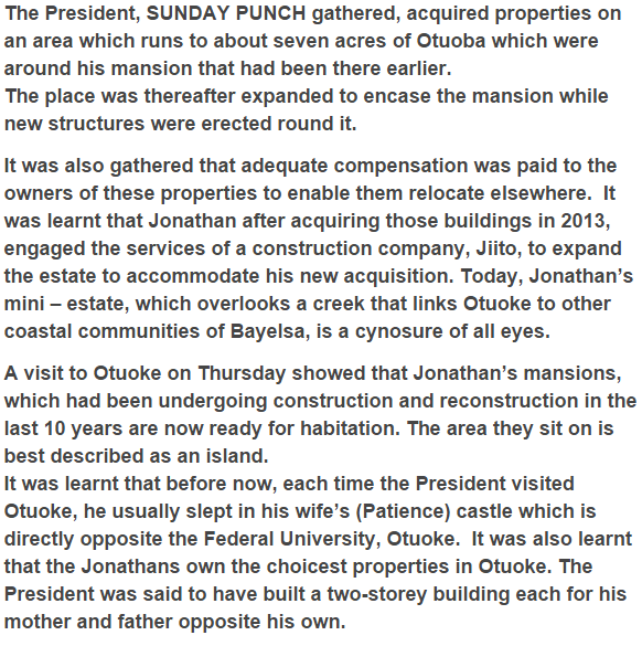 After May 29, President Goodluck Jonathan will leave the Aso Villa. PUNCH’s Simon Utebor was at the President’s Otuoke, Bayelsa State-nation home where he is required to resign to. The air around the sprawling bequest, he says, is amazingly cool. Glancing around, the response to this rapidly day breaks on him. The domain is inverse a river, and the moving breeze continues impending.