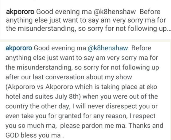 Comedian Akpororo has apologize to Actress Kate Henshaw after she’d angrily posted a letter on her instagram page, that was issued by her management earlier today, demanding that her name be disassociated with the comedian’s upcoming event.