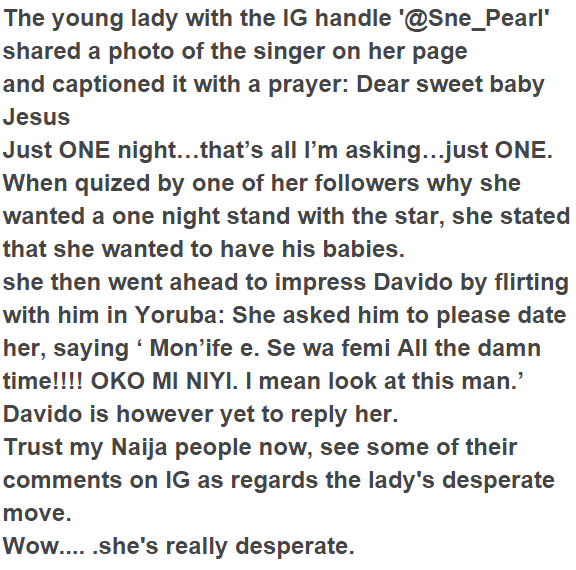 With no pride or disgrace, a South African fan of Davido took to her Instagram page couple of hours ago to flirt with the 23-year-old music star.