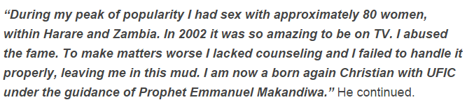 The born again on-screen character, as indicated by pulse.com.gh, uncovered in a meeting that he cleared out Nigeria on April 2011 to Zambia where he tuned in different plays on educating about HIV and AIDS without his wife and two children for six month, and wound up laying down with 80 ladies.