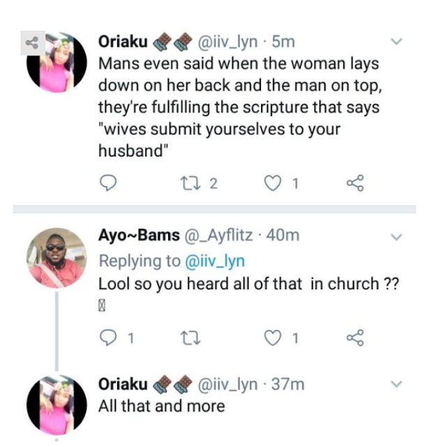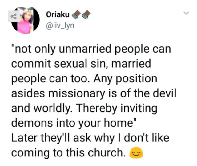 Based on @iiv_lyn who stated that the preaching is certainly one of her reasons for not visiting church, the Pastor stated that married couples can commit sexual sin together if they’ve s2x in virtually any position apart from missionary style