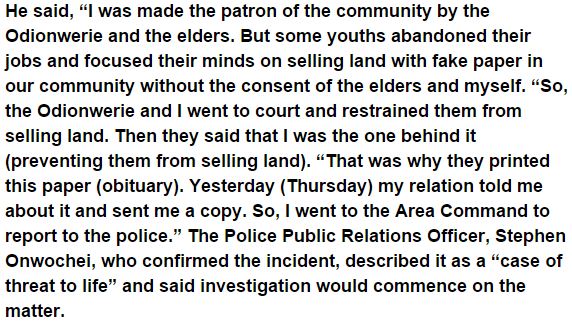 The father of 13 said his fight with the people began after he went to court to restrain them from participating in unlawful sale of the Land area without the assent of elders. He encouraged the police to unmask the offenders behind the act.