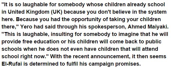 It will be reviewed that the past governor of the state, Ramalan Yero, had in the build-up to the 2015 gubernatorial races portrayed El-Rufai, free education promise as “”funny” and ‘insulting’.