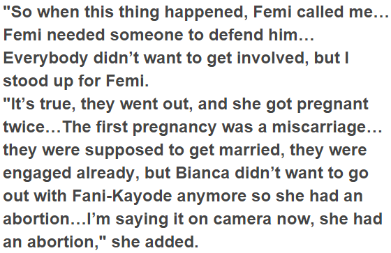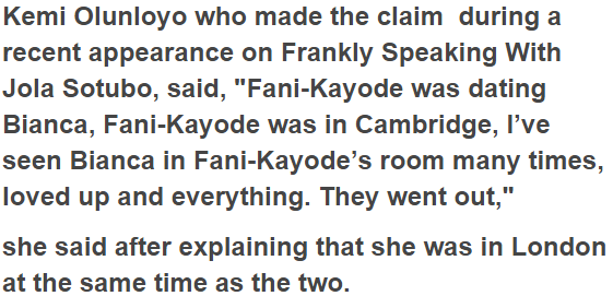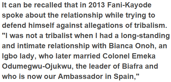 In another explosive interview, Social media marketing personality, Kemi Olunloyo has revealed how Femi Fani-Kayode had a connection with Bianca Ojukwu and even got her pregnant twice when they certainly were younger. In a recent interview, Kemi Olunloyo, the controversial daughter of former governor of Oyo State, Victor Omololu Olunloyo, has revealed that former Minister of Aviation, Femi Fani-Kayode had a connection with Bianca Ojukwu and even got her pregnant twice when they were younger.