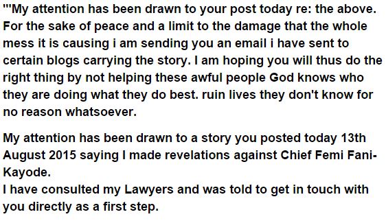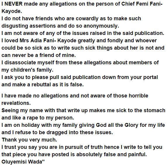 Mrs Yemisi Wada, ex of Femi-Fani-Kayode, has distanced herself from reports citing her as throwing slanders at her ex and his mom. In writings to some online daily papers, she debilitated legitimate activity against the individuals who distributed the story. Full content of the message bellow.