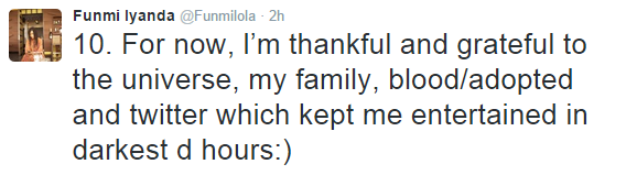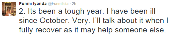 As she turned a year older , TV character Funmi Iyanda took to twitter to uncover she’s been combating with an undisclosed ailment since October a year ago. See more tweets bellow.