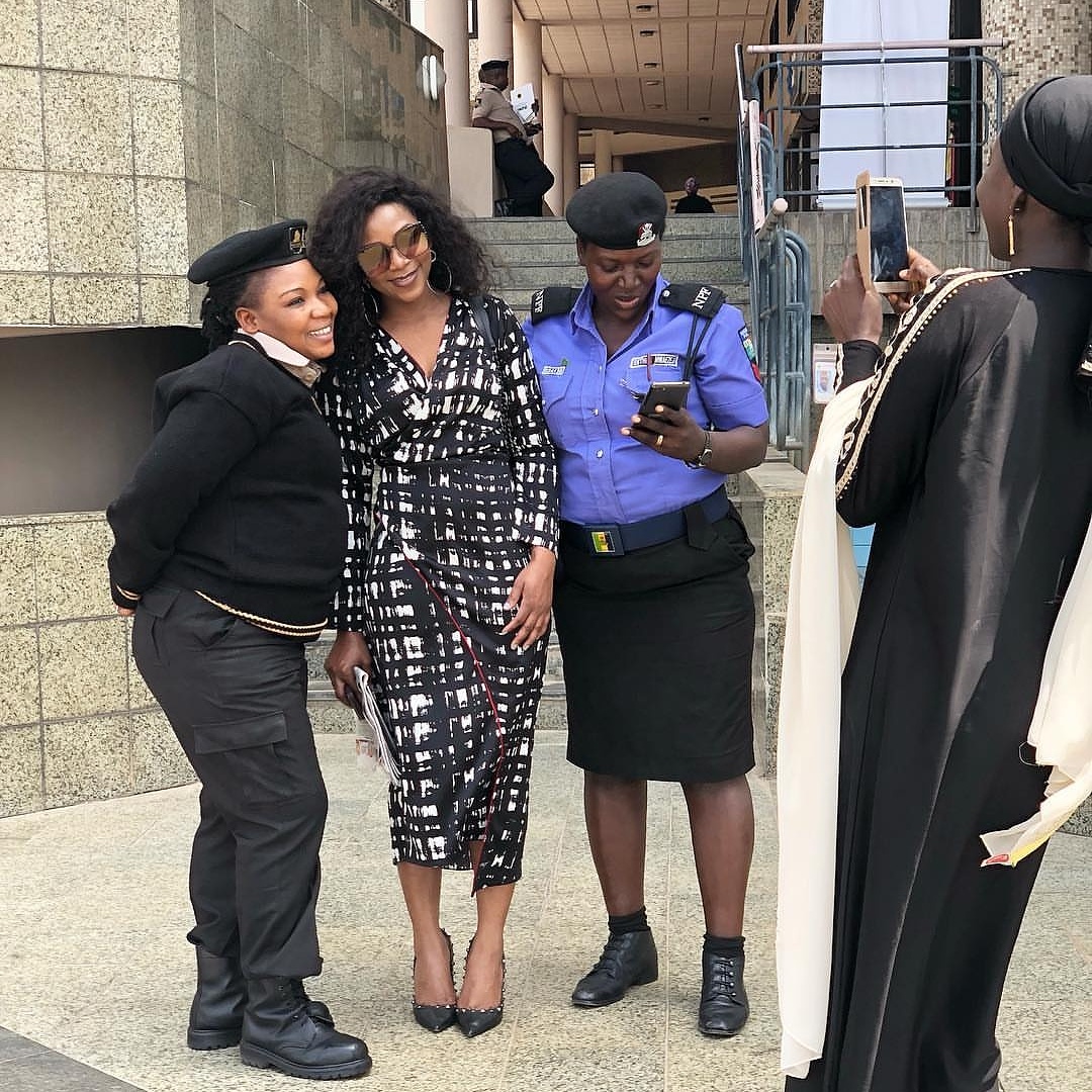 Star actress,Genevieve Nnaji looks stunning as she took photos with two uniformed women .The actress shared the photo on Instagram with caption ‘supporting women’.