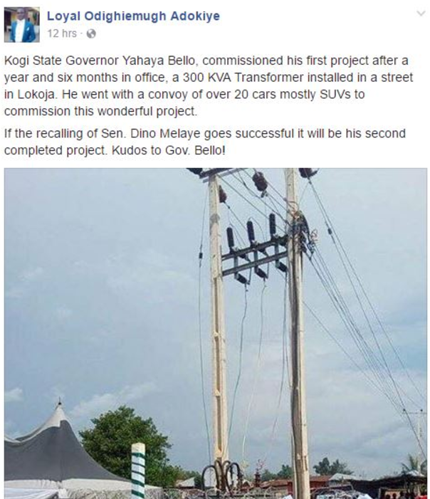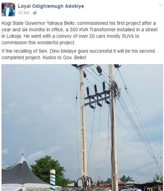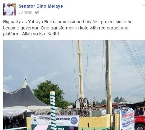 Senator Dino Melaye also shared the photo and captioned it: Big party as Yahaya Bello commissioned his first project since he became governor. One transformer in koto with red carpet and platform. Allah ya isa. Kai!!!!