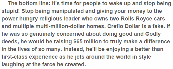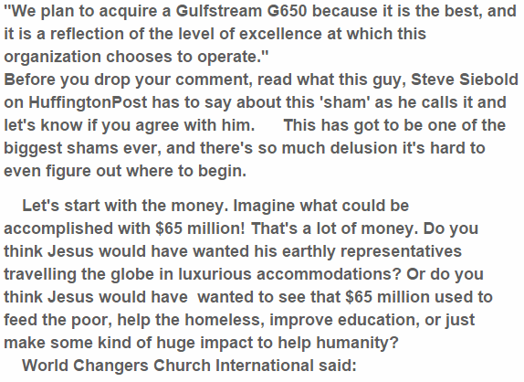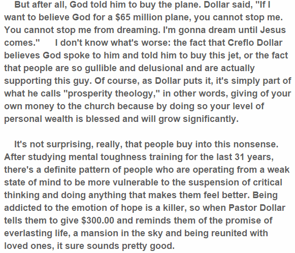 But the moment Pastor Dollar asked his 200,000 adherents to each give $300.00 towards the purchase of an extravagant plane, the campaign vanished and was deleted from his site.