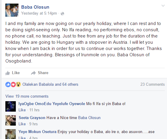 ‘I and my family are now going on our yearly holiday, where I can rest and to be doing sight-seeing only. No Ifa reading, no performing ebos, no consult, no phone call, no teaching. Just to free from any job for the duration of the holiday. We are going to Hungary with a stopover in Austria. I will let you know when I am back in order for us to continue our works together. Thanks for your understanding. Blessings of Irunmole on you.