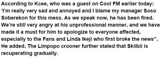 The Five Star Music camp is not in an agreeable disposition right now. The lebel has been at the centre of the Skiibii ‘Passing Stunt’ that overflowed the Nigerian media on Friday, August 14, 2015. The lebel’s lead act, Kcee has recently affirmed that Soso Soberekon, before now the General Manager of Five Star Music, has been terminated for deceiving the general population on the Skiibii demise story.