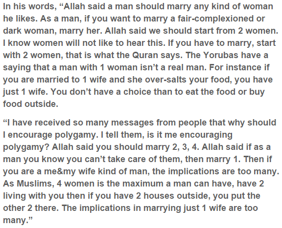Renowned for his intense lectures, prominent Islamic scholar-cum-preacher Sheik Muyideen Bello has a mantra – talking truth to power. What’s more, he is bold about it. In one of his addresses titled Legal Marriage, Sheik Bello talked concerning why a man ought to wed more than 1 wife.