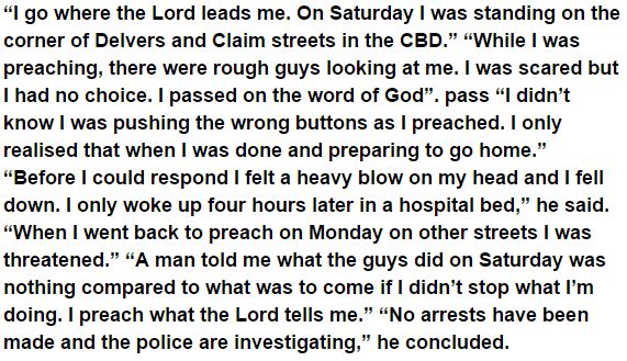 Daily Sun reports that the pastor of The Evangelical Christian Assembly of South Africa spent Saturday lecturing about drugs, wrongdoing and roughness, and against Islam in the boulevards and parks of Joburg. All of a sudden, two young fellows halted him (One Alleged to be a muslim) and let him know that he had a big mouth.