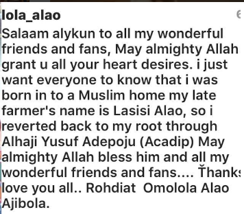 Naturally anyone from yoruba land has roots to Ifa and Irunmole which is the real or the oringinal root, in igbo land, it’s debia or odinani the rest could be defined as semi root. However, actress Lola Alao said she only coverted to her roots claiming Islam.