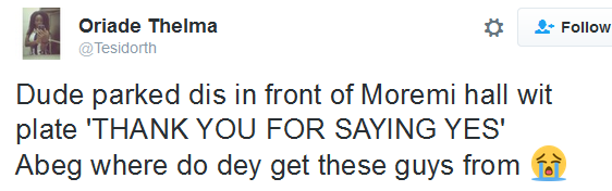 as per the twitter user, who shared the photo, a man presented this car to his lady at Moremi Hall, UNILAG for saying YeS to his proposal. A “Many thanks for saying yes” is inscribed on the vehicle plate.