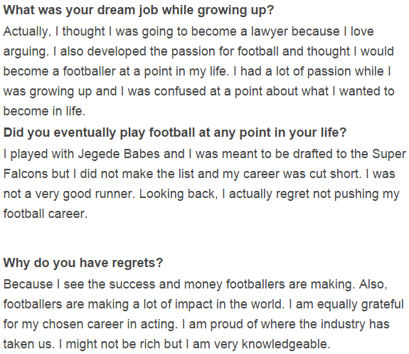 The performer said she laments not pushing her career in football forward then, in light of the fact that she now sees the cash footballers make and now feels terrible about it.