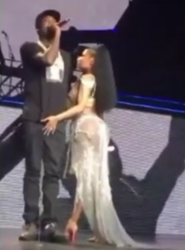 Nicki Minaj applies some genuine smooching on Meek Mills masculinity while he was singing in front of an audience. Minaj I never knew you could do something like this in a spot like this.