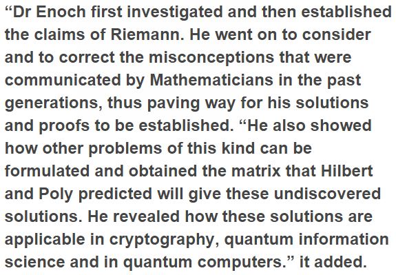 An announcement in Ado Ekiti, the Ekiti State capital yesterday, said Dr Enoch presentation of the Proof on November 11, 2015 amid the International Conference on Mathematics and Computer Science in Vienna, Austria turns out to be more symbolic coming on the exact day and month 156 years after the issue was delivered by a German Mathematician in 1859.