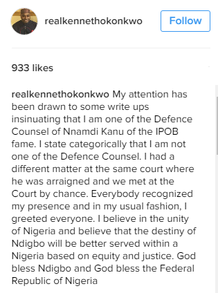“I’m not Nnamdi Kanu’s lawyer. I believe in the unity of Nigeria,” actor and Barrister Okonkwo speaks on his court appearance yesterday.