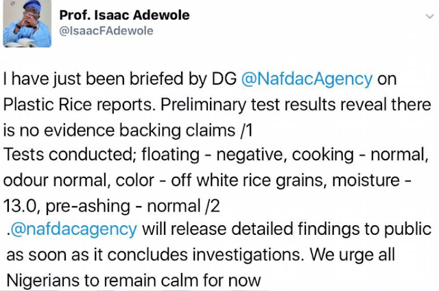 The Nigerian Health Minister took to twitter to reveal the Preliminary test results saying that ‘there is no evidence backing the plastic rice claims’ –