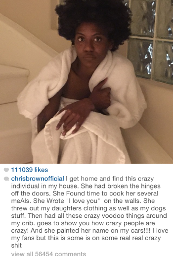 Chris Brown just took to instagram to say he found this lady in his home and a some of the things she did inside. No word on the off chance that she’s in police custody. Terrifying!