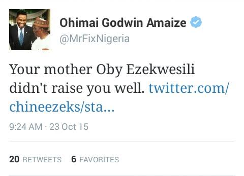 One of Oby’s child – Chine Ezekwesili began the dramatization by offending Ohimai Amaize over his choice to leave PDP which he reported on twitter yesterday. The previous Special Adviser wasn’t going to take it and took to twitter to reply Chine. Online networking is sweet and depleting. haha. See their offending tweets to one another bellow.