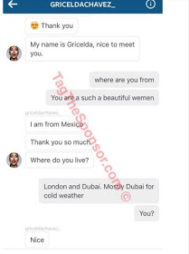 According to tagthesponsor.com a sites that exposes celebrities and model that visit Dubai for shady buisnesses, Gricelda Chavez chats were exposed where she agreed to have sex for money and also perform fetishes like corprohilia , farting and inserting snake into the rectum of the Dubai mogul, alt