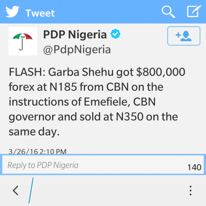 Opposition Restriction Peoples Democratic Party, PDP through its verified Twitter handle had claimed that the Senior Special collaborator to President Muhammadu Buhari ,Mallam Garba Shehu got USD 800,000 at N185 from the CBN on the guideline of the apex bank representative, Godwin Emefiele. The party further asserted that Shehu sold the said sum that day at N350.