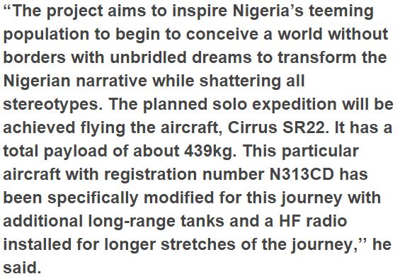 He said hisjourney will start in Lagos and take him round the 7 mainlands of the world. It will take 6 weeks to finish and he will end his voyage in Lagos at some point in May.