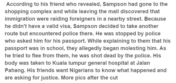A Nigerian man named Enekwenchi Sampson Someadina from Enugu was supposedly shot dead by police yesterday night around 10:32pm at One Taman shopping complex in Damasara, Malaysia.