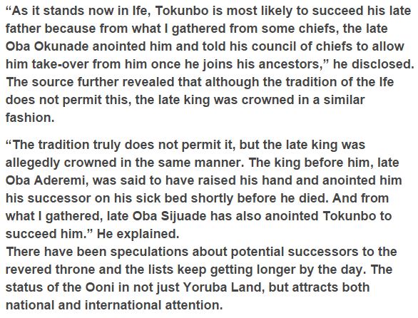 On the off chance that antennas coming to National Weekender from the old Yoruba city of Ile-Ife, are anything to pass by, the sit tight for another Ooni to the throne of the ancient city, may not be long. This on the quality of dependable information which emphatically recommends that the first child of the late Ooni , Oba Okunade Adele Sijuade, Prince TokunboSijuade is liable to succeed his dad as the following traditional leader of Ile-Ife.
