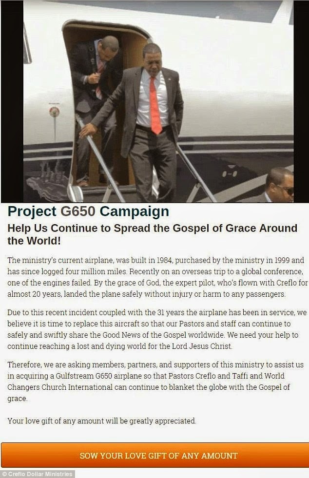 Mainstream TV minister and author of World Changers Church International, Creflo Dollar, has deleted the site where he was asking individuals to give $65million for him to purchase a fresh out of the box private jet.