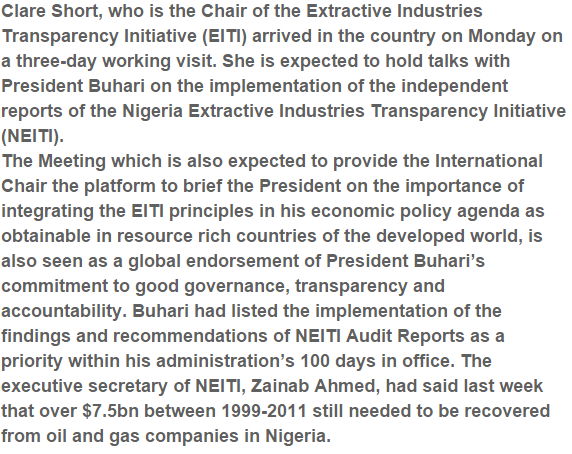 As President Buhari hosts the top of the leading global corruption watchdog Clare Short this week, top on the agenda would have been a probe of how Nigeria allegedly remitted only $100m for the sale of oil blocks which the united states was paid $1.85bn, credible sources have revealed.