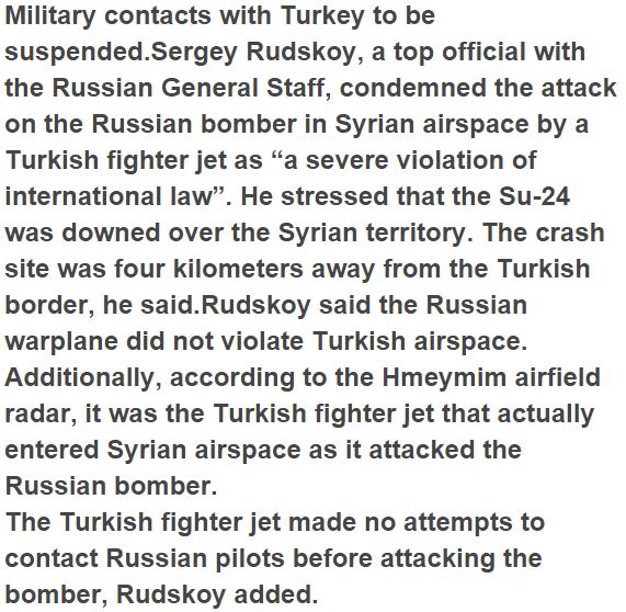 Moscow arrangements to suspend military participation with Ankara after the bringing down of a Russian plane by Turkish aviation based armed forces, Russian General Staff agents said on Tuesday. Further measures to beef Russian air base security in Syria will likewise be taken.