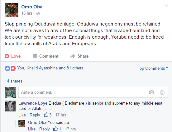 Oduduwa hegemony must be retained. We are not slaves to any of the colonial thugs that invaded our land and took our civility for weakness. Enough is enough. Yoruba need to be freed from the assaults of Arabs and Europeans.
