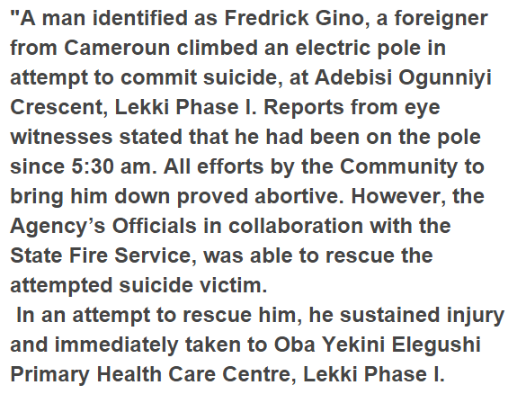 Home / News From Nigeria / Breaking News / “Suicide Victim is receiving treatment at a hospital”- LASEMA (Video & Photos)