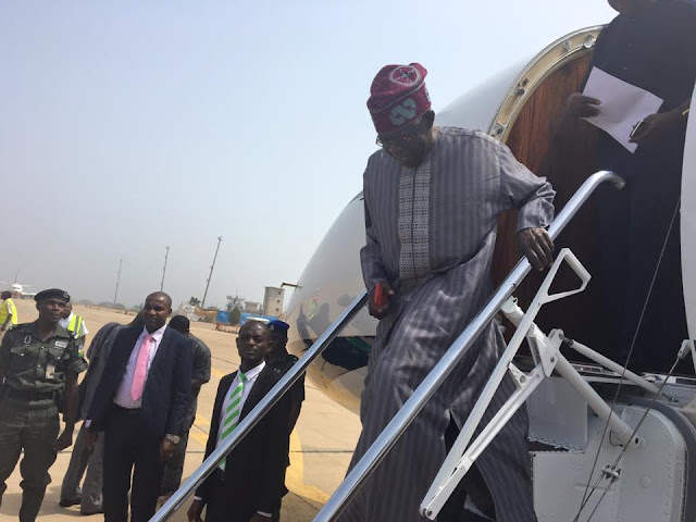 The APC pioneer and previous Governor of Lagos State His Excellency Asiwaju Bola Ahmed Tinubu the Jagaban lands in Kaduna for the launch of Kaduna State Government Taxi Scheme, Kaduna Cabs and received at the airplane terminal by the Governor of Kaduna State His Excellency Malam Nasir El-Rufai and his escort.