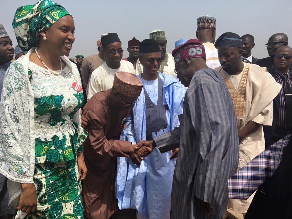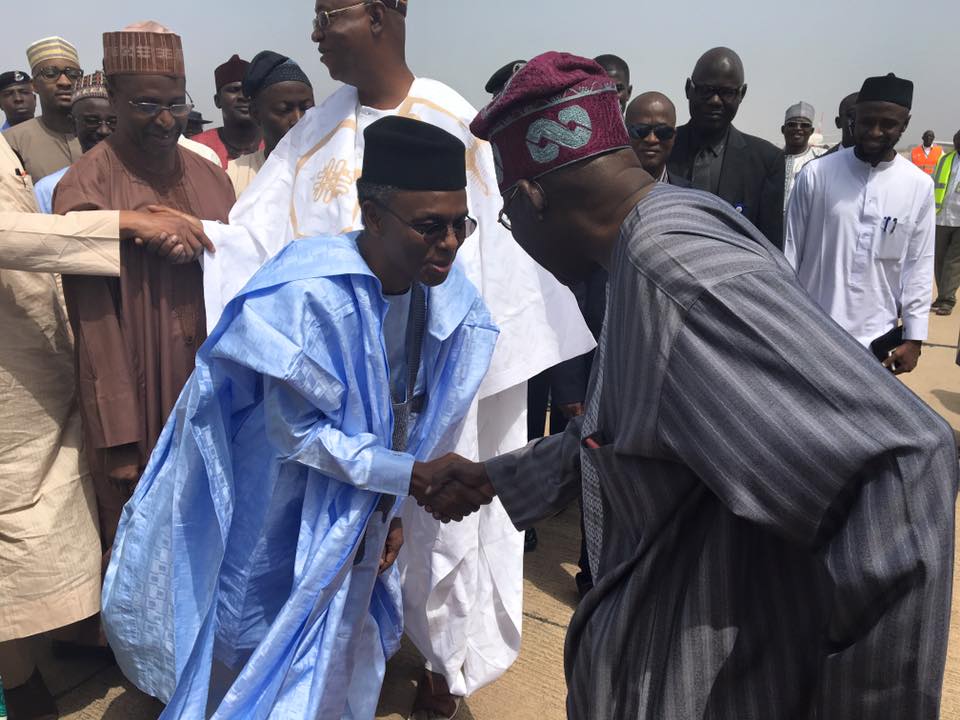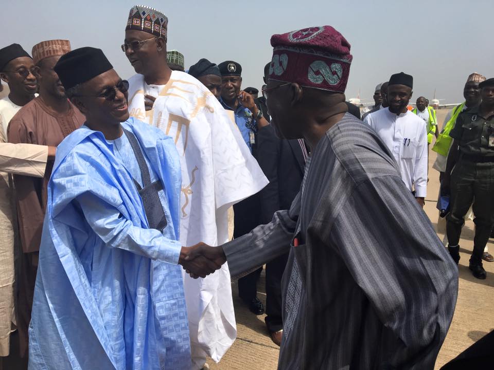 The APC pioneer and previous Governor of Lagos State His Excellency Asiwaju Bola Ahmed Tinubu the Jagaban lands in Kaduna for the launch of Kaduna State Government Taxi Scheme, Kaduna Cabs and received at the airplane terminal by the Governor of Kaduna State His Excellency Malam Nasir El-Rufai and his escort.