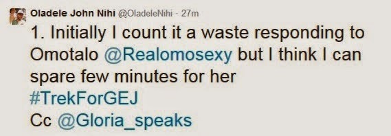 A couple of days back, Omotola tweeted that young people embarking on trekking for lawmakers are trekking their futures away. One of thetrekkers, Oladele Nihi simply answered her.