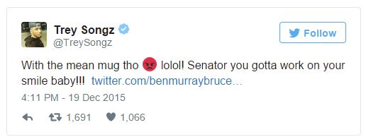 Trey Songz who saw the tweet tongue in cheek answered and ridiculed Senator Ben Bruce’s mean face, saying he looked mean and ought to figure out how to grin. What do you think about this photograph, do you agree with Trey Songz?