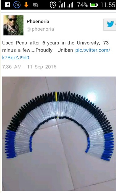 Uniben student ( @phoenoria ) twit pics of 73 used pens through 6 years of Undergraduateship. You