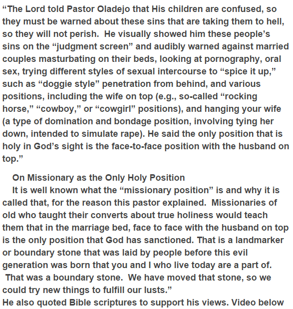 The head minister of Complete in Christ Church (CICC), asserted he saw individuals being rebuffed in hellfire (hmmnn like story for the Gods) for shameless and unholy sexual acts that incorporate oral sex, masturbation, demonstrations of subjugation and positions like “doggy” and ‘cowgirl’.
