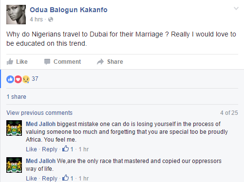 Facebook user would like to know why some Nigerians travel to Dubai for their Marrige. He shared this on facebook “Why do Nigerians travel to Dubai for their Marriage ? Really I would love to be educated on this trend.”