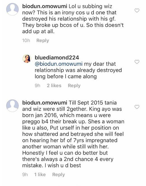 “You subbing Wiz now”, which of course confirms she was indeed shading Wizkid.. She responded Omowumi as thus: “My dear that relationship was already destroyed long before I came along”.