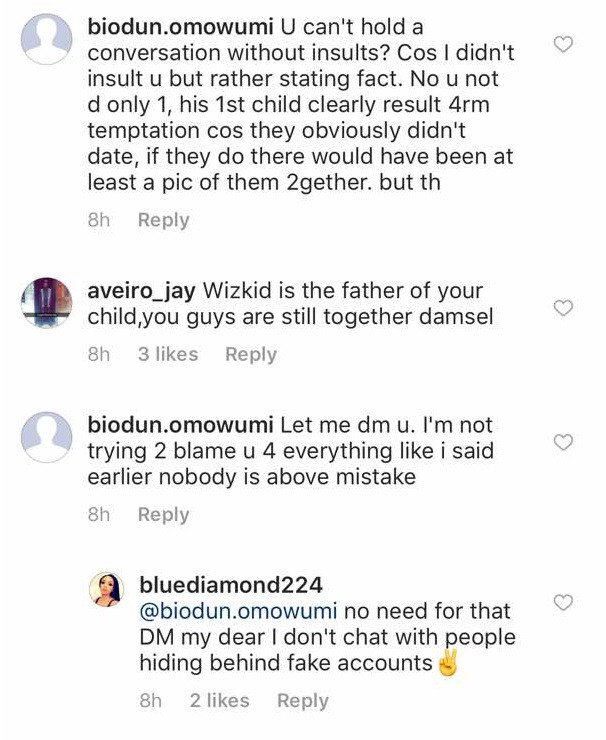 “You subbing Wiz now”, which of course confirms she was indeed shading Wizkid.. She responded Omowumi as thus: “My dear that relationship was already destroyed long before I came along”.