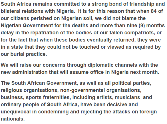 SA government has released a press statement communicating their dismay over Nigerian government’s choice to recall her envoys taking after Xenophobic assaults in SA.
