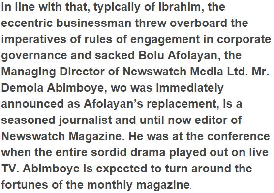 The Group Managing Director of Energy Group, Jimoh Ibrahim, did the unfathomable Monday when he sacked Bolu Afolayan, the Managing Director of one of his organizations, Newswatch Media Ltd. amid a live TV show in Abuja, Nigeria’s capital. This followed after a prostest by a few individuals from Nigerian Union of Journalists, NUJ, the fifth Energy Group GMD Conference held at the Nicon Luxury Hotel, Abuja.